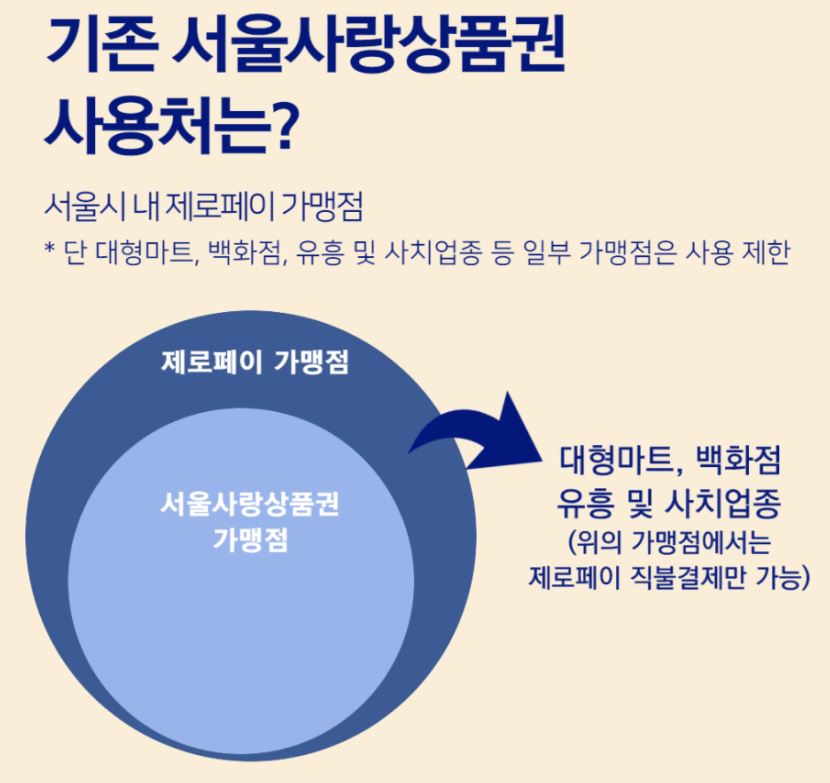 기존에도 제로페이 가맹점 말고, 선결제 서울사랑상품권은 대형마트 및 백화점 유흥사치업종에서 사용이 불가능했다.하지만 변경된 사용범위는 더욱 협소하게 제한이 되었다.