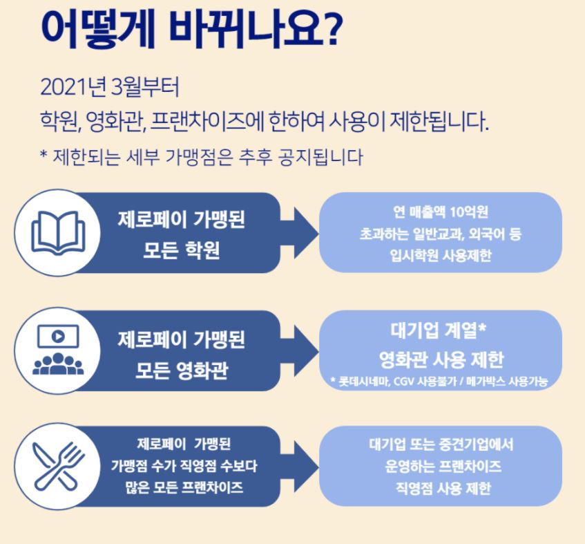 연매출 10억이상의 학원 및 교육기간에서 사용이 안되고 대기업 계열 영화관에서도 사용이 되지 않는다. 그리고 대기업 중견기업의 프랜차이즈 음식점에서도 사용이 되지 않게 변경되었다.