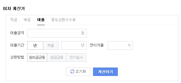 → 금융거래시 유용한 정보 내 "주택담보대출가이드"클릭" → 대출 정보입력 → 계산하기 클릭!