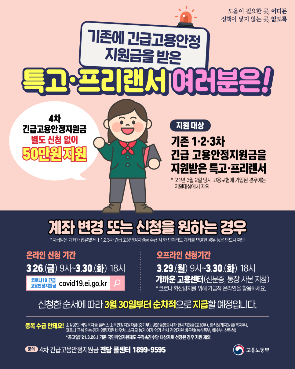 ▶기존 1·2·3차 긴급 고용안정지원금을 지원받은 특고·프리랜서에게 50만원을 추가로 지원.